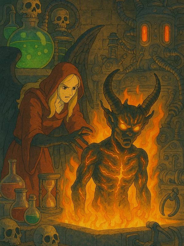 Thus, she bound the writhing essence of a demon to the fractured soul of a planar traveler, captured from beyond the stars. The fusion did not simply create a servant—it birthed an artificer of horrors. Hedron’s bones were laced with burning sigils, and his veins flowed not with blood but molten fire. Where others wielded sword or claw, Hedron learned to build. He twisted bone into machinery, flame into fuel, and suffering into invention.