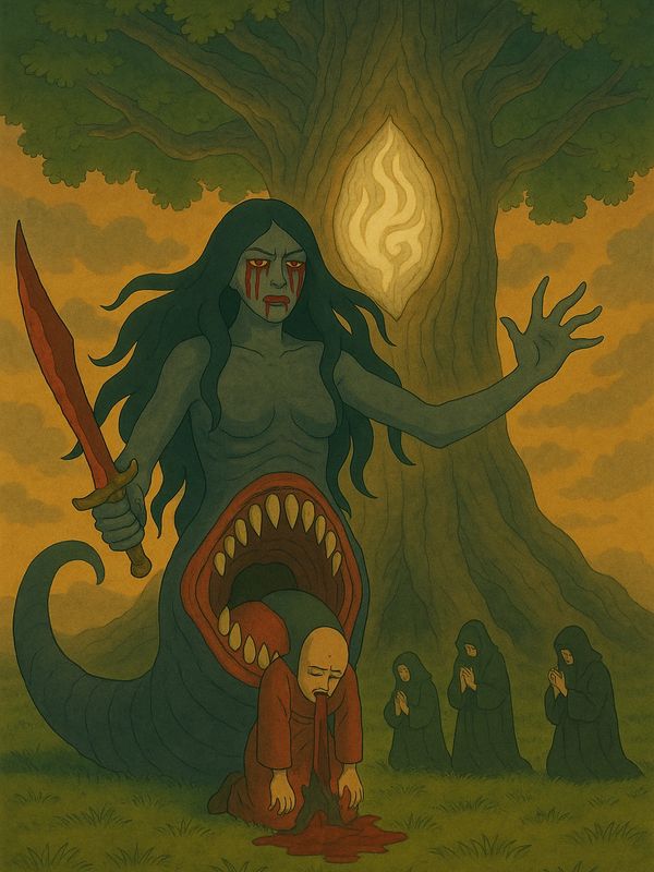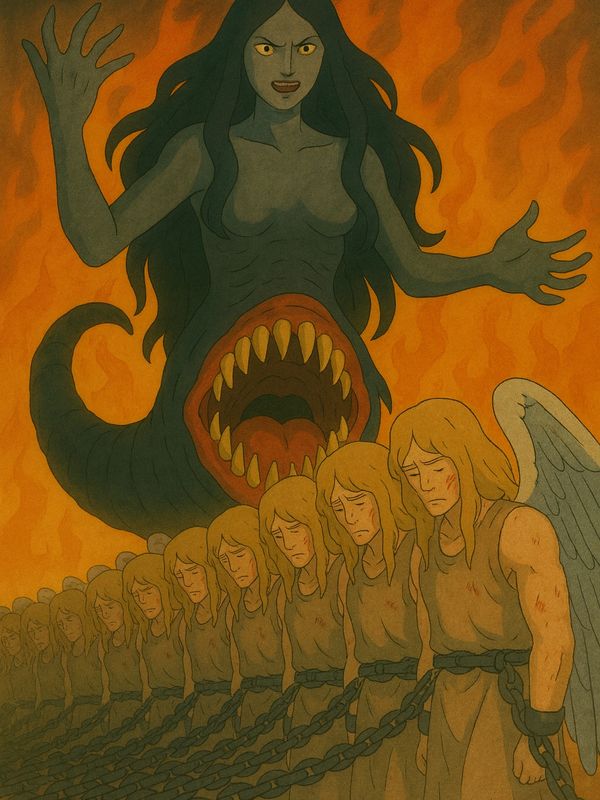 Her maw has tasted many offerings—kings, prophets, and even rival demons—but none have been enough. She waits, hungers, and schemes, her bleeding eyes fixed upon the heavens.